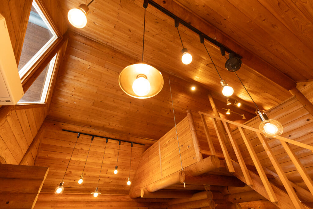 高さを変えて配置された照明が、部屋全体を暖色光で優しく包み込む。